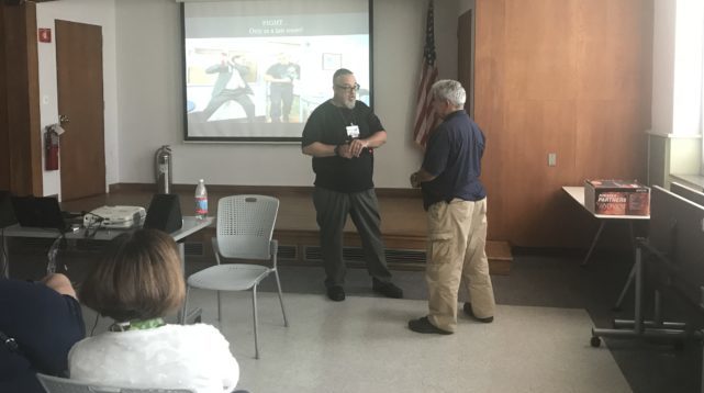 Our active shooter seminars cover the more robust “run-hide-fight” technique, and we put them to practice in our active shooter drills. See below for an example of a real drill performed for a local library on Long Island: